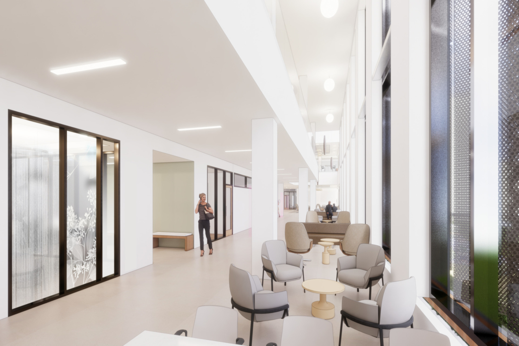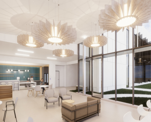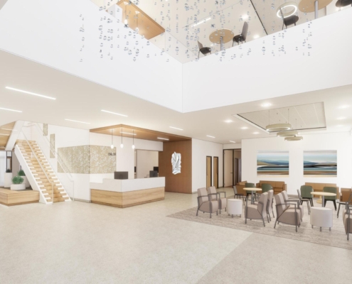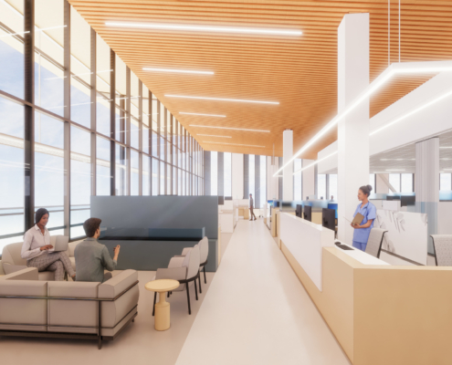 This state-of-the-art facility is designed to transform healthcare in the region for generations, offering a patient-centered environment enriched by high-end finishes, biophilic design elements, abundant natural light, soaring ceilings that create spacious interiors, and expansive curtainwalls with protected deck areas that foster a strong connection to the outdoors—all guided by the latest innovations in cancer treatment design and care strategies.