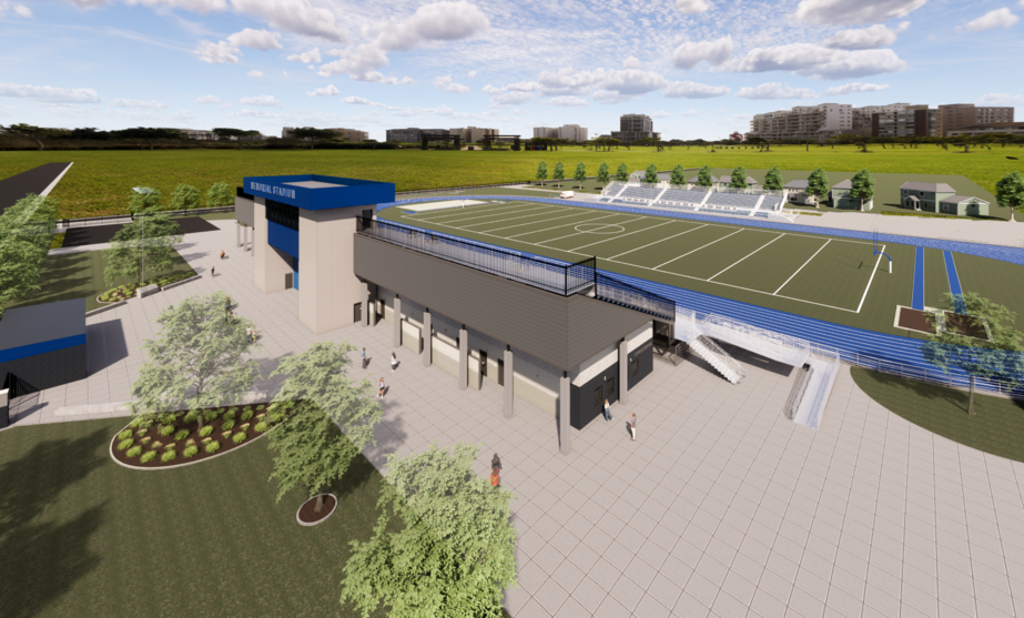 Key facilities include the 3,600-square-foot west wing with concessions, restrooms, and training areas; 3,600-square-foot east wing featuring locker rooms and storage; 2,800-square-foot, two-story press box with new ADA elevator access; dual ticket booths; and an 11,500-square-foot fieldhouse providing expanded locker and training facilities.