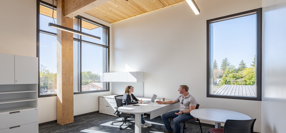 Delivered through a design-build partnership with Dreyfuss + Blackford Architecture, the $14.5 million, 22,132-square-foot, two-story facility consolidates campus operations into a single, efficient, and forward-looking structure. Mass timber elements—orchestrated by Timberlab—serve as both a sustainable and aesthetic choice, enhancing the workspace with biophilic warmth while significantly reducing embodied carbon.